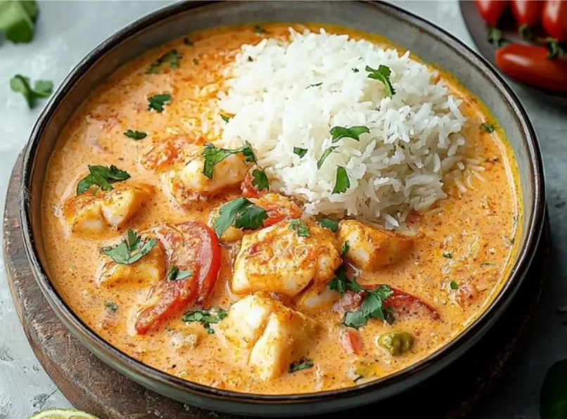 - Servez le curry de poisson bien chaud, accompagné de riz basmati.