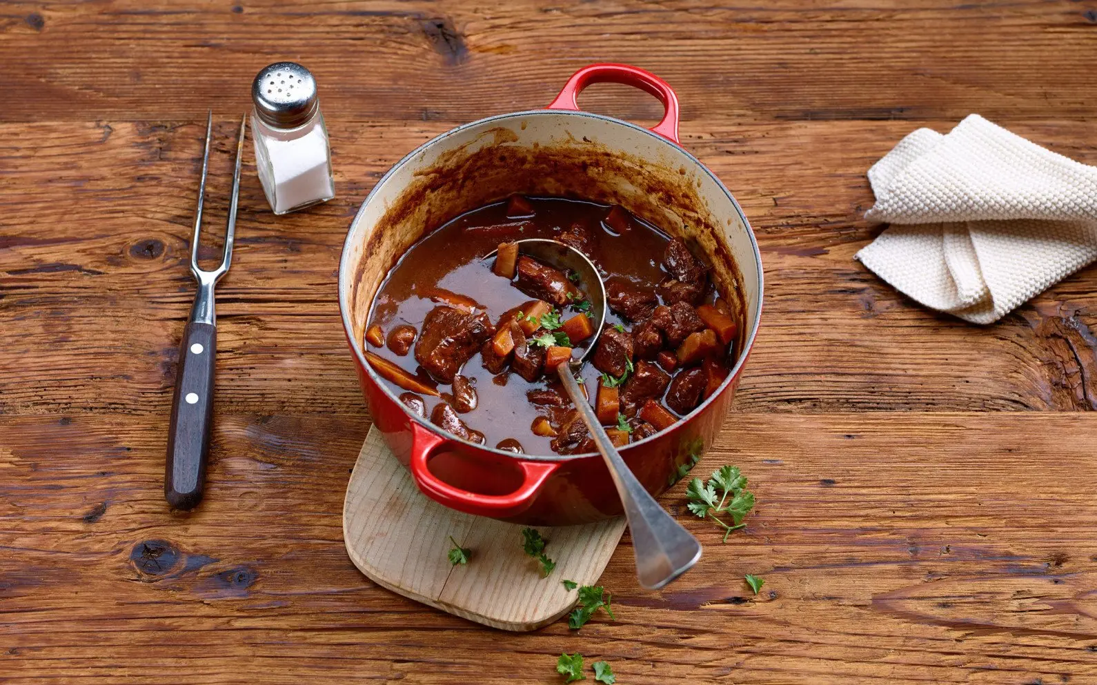 - À la fin du temps de cuisson, vérifier avec ta fourchette à viande si les morceaux de ragoût sont prêts. Si elle s’enfonce sans résistance, c’est cuit.